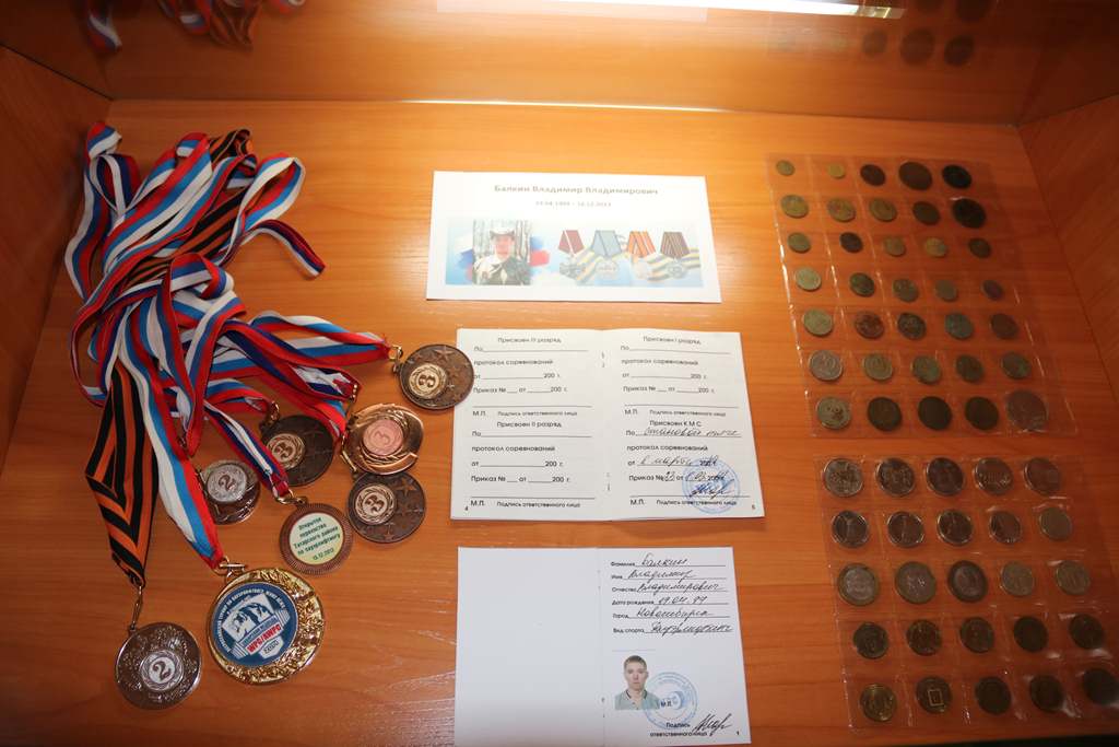 Она поблагодарила семьи воинов за предоставленные материалы. Среди них – кольчуга, сплетенная руками Алексея Гундина. Рядом – монеты, которые коллекционировал Владимир Балкин, и его медали, завоеванные в соревнованиях по пауэрлифтингу. Рядом – стихи Валерия Усольцева. Тут же альбом Николая Нестеренко. Он его составлял, находясь в зоне СВО. В альбоме – фотографии его и боевых товарищей, а также надписи, сделанные рукой Николая. Тут и почтовые марки, которые Александр Зенков собирал с подросткового возраста.